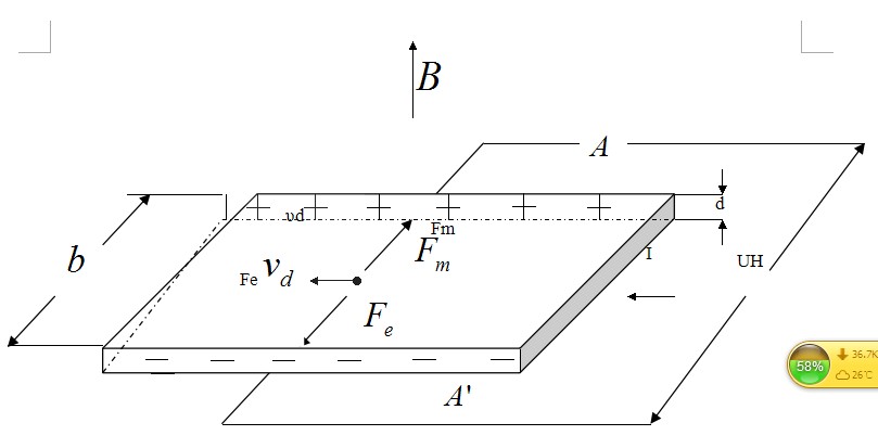 所謂霍爾效應:相當于把一塊寬為b,厚為d的導電板放在磁感應強度為B的磁場中,并在導電板中通以縱向電流I ,此時在板的橫向兩側(cè)面A、A′,之間就呈現(xiàn)出一定的電勢差,這一現(xiàn)象稱為霍爾效應,所產(chǎn)生的電勢差UH稱霍爾電壓。高斯計就是利用這一原理來測量磁場強度的。如圖所示: